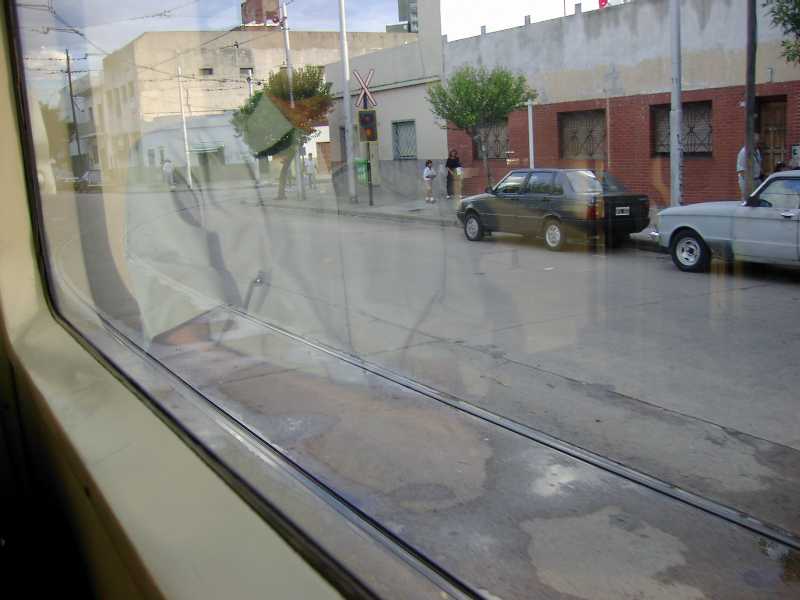 また、Fernandez de la Cruz駅とPte. Illia駅の間は、道路が一方通行のため軌道も上下線が分かれます。左の写真はF. de la Cruz側の分岐箇所を車内から写したもの。車内の映り込みがが激しいですがご容赦下さい。