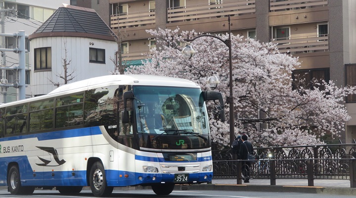 高速バス・送り込みライナーが雁行する街道。桜の樹の脇も走る。