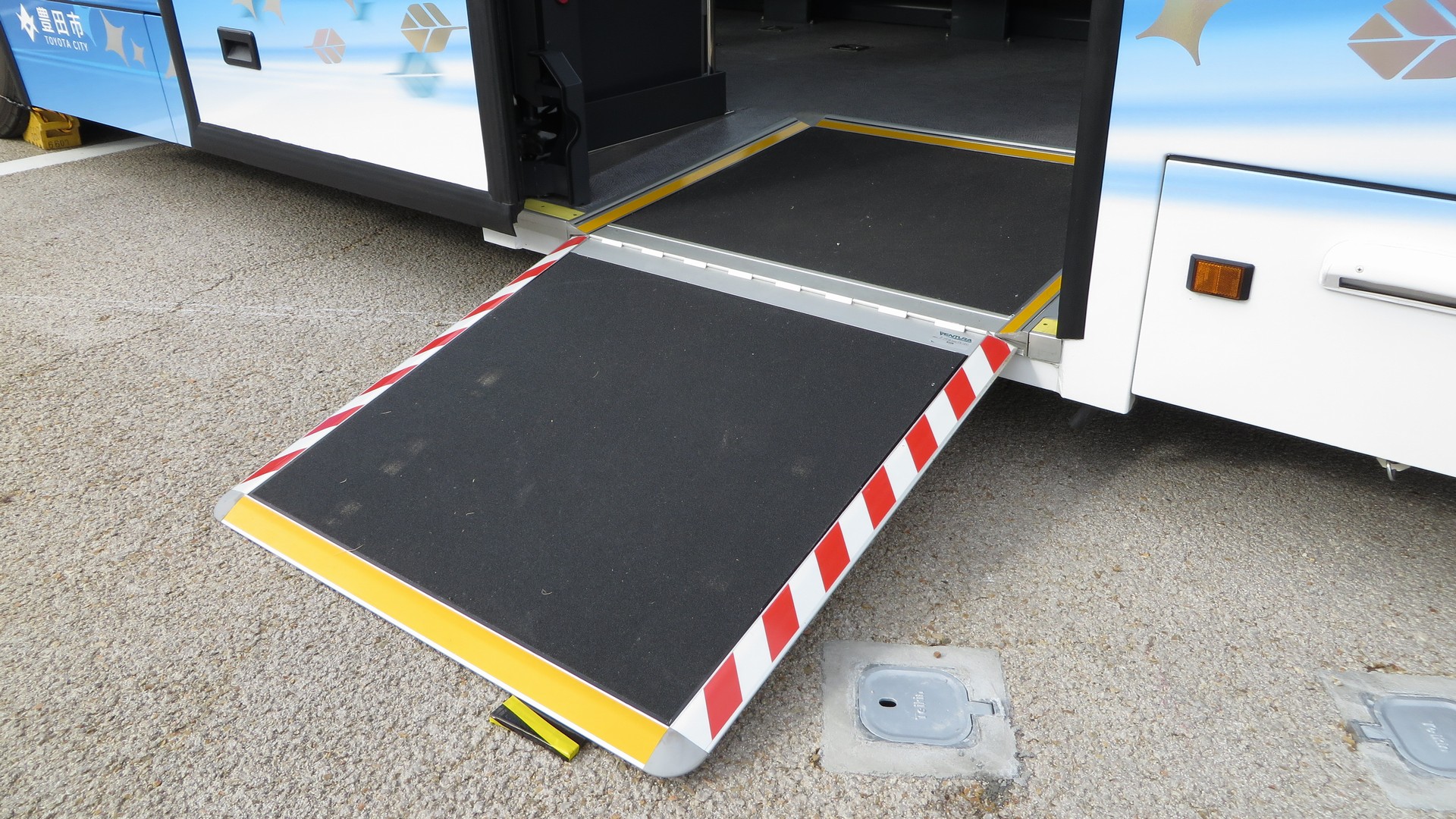 段差なしの柵付きで、バスの展示というよりは博物館に置かれた路面電車みたい。