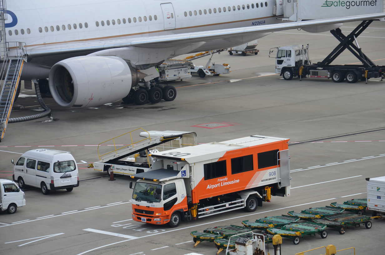 通常はランプバスで駐機位置まで行ってタラップを上がるんだけど、車椅子の人はこれに乗って行って、荷台部分が上に上がるんだよね。